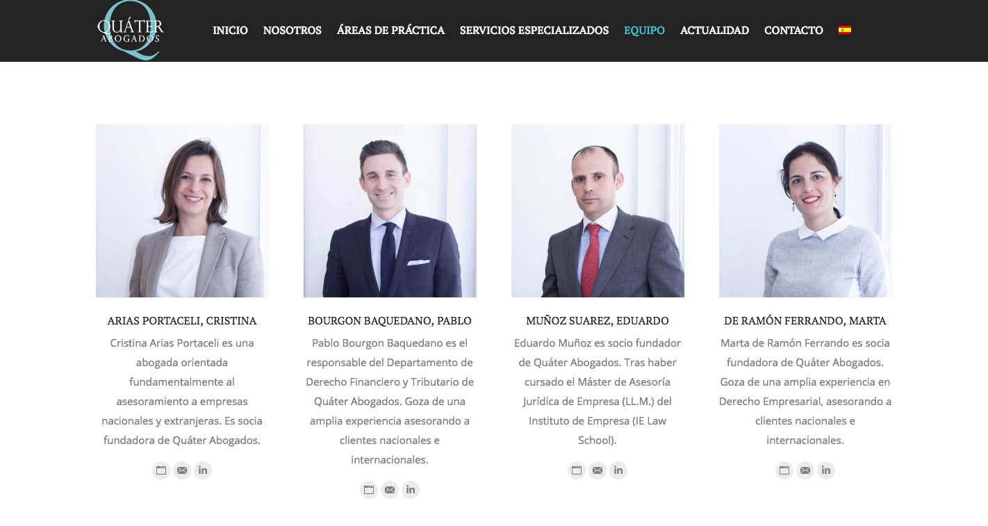 Cliente: Quater abogados, asesoramiento integral y acompañamiento personalizado y cercano a empresas, particulares y administración pública con los más altos estándares de calidad, eficacia e inmediatez.